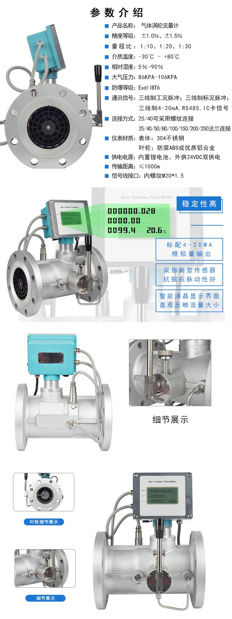 一體化氣體渦輪流量計結(jié)構(gòu)為防爆設(shè)計,可以顯示流量總量,瞬時流量和流量滿度百分比。電池采用長效鋰電池,單功能積算表電池使用壽命可達5年以上,多功能顯示表電池使用壽命也可達到12個月以上。